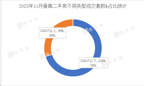 成交结构上,数据显示,11月番禺二手房成交主力户型为110㎡以下的刚需,共成交1166套,占比70%,而110㎡以上的改善户型成交496套,占比30%。