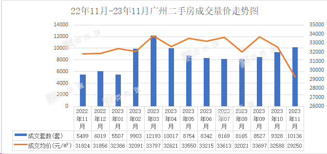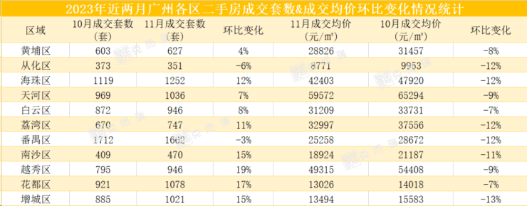 二手房方面,11月广州二手房成交均价29250元/㎡,环比、同比降幅均为10%,这是近一年来二手房成交均价最低的月份。