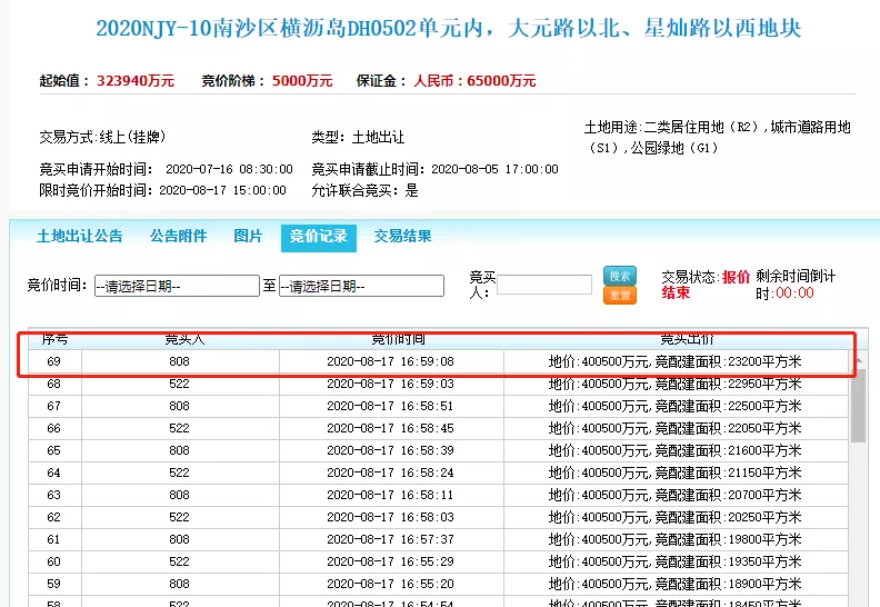 8月17日下午3点,多家实力房企参与2020NJY-10南沙区横沥岛地块(DH0502单元内,大元路以北、星灿路以西)竞拍环节,长达120分钟竞拍,最终到达封顶地价和竞配面积:40.1亿元总价+人才公寓23200㎡配建面积,该地块溢价23.6%,扣除配建后楼面价达19140元/㎡,成为横沥岛楼面价新高!