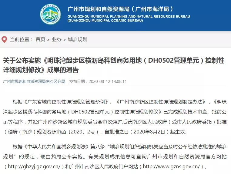 8月12日,官方发布了关于公布实施《明珠湾起步区横沥岛科创商务用地(DH0502管理单元)控制性详细规划修改》(此次出让地块位于DH0502单元内)成果的通告。此次调整较大的变化则为原来的几大商业地块,更变为四块纯住宅地块;依较新的调整规划来看,横沥岛尖的纯住宅用地将达到24块,商业居住混合用地为34块,涉及居住属性地块总合计为58块。
