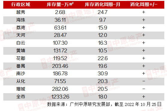 就拿增城来说,广州中原研究发展部统计数据显示,截至10月25日,增城的新房库存面积为全市排名前列,达到了282.06万㎡,库存消化周期达到了20.5个月,位居11区中第三。