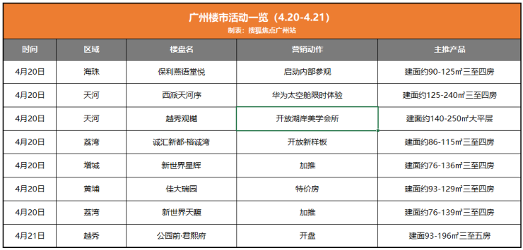 据搜狐房产广州站不完全统计,本周末有多盘有营销动作,其中本周六海珠的保利燕语堂悦将启动内部参观、荔湾的诚汇新都·榕诚湾开放全新样板间、天河的西派天河序举行华为太空舱体验展示,越秀观樾开放湖岸美学会所、越秀区的公园前·君熙府则将于周日正式开卖。