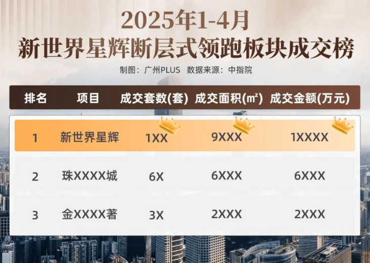 根据中指院数据显示,今年1-4月,新世界星辉以断层领先的优势,成为了板块内成交套数、成交面积、成交金额“三冠王”。