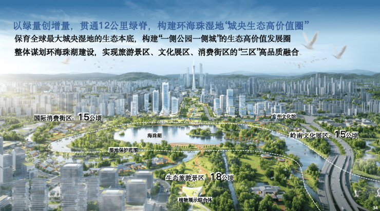 广州新中轴的精华与未来,尽在海珠段。这里规划的不仅是“一塔一场四馆”的地标群,更有一条从广州塔直抵海珠湖的中央绿轴,以及环湿地形成的“城央生态高价值消费圈”。新中轴海珠段以其“生态为底、文商旅融合、数字经济赋能”的差异化路径,成为公认的价值洼地与未来高地。这里不仅有环海珠湿地构筑的稀缺生态本底,更规划了国际消费街区与绿色科技总部集群。这种独一无二的“生态+消费+产业”模式,使其避免了单一功能区的局限,具备了更持久的发展动力,从而凝聚了强大的市场共识:这里是广州未来十年最具确定性的价值增长极。