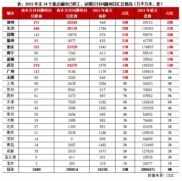 郑州、长沙、重庆和武汉问题项目均超2万套据CRIC不完全统计数据显示,截至2021年末,24个重点监测城市尚未交付的问题项目总建面约2468万平方米,占2021年商品住宅成交总面积比重达到10%。