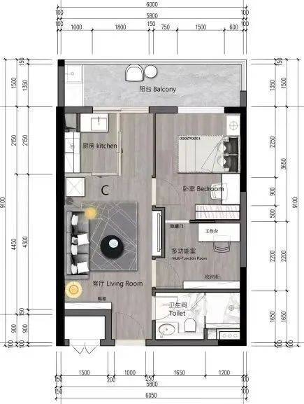 该户型偏向于公寓式设计,层高3米,开放式厨房设计,约5.7米的大阳台,提升了整体的空间亮度。