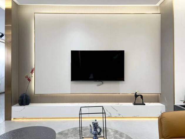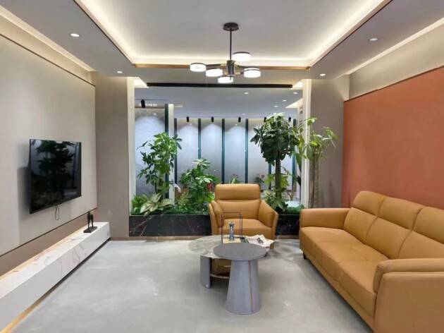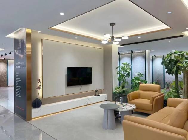 湖州安吉鹰牌陶瓷旗舰店,将现代流行家居风格重新定位,客厅整体采用原木色鹰牌墙板作为主色调,搭配皮纹质感的鹰牌墙板-C8PG115E冰茶橙-荔纹,空间层次感再上新阶,融入流畅的几何线条和柔和的射灯布局,沉浸式让消费者体验现代健康生活美学。