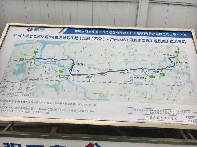 截至目前,八号线北延段(滘心-广州北站)土建工程累计完成16%。11座车站中,7座开始进行土建施工,江府站由八号线北延段支线建设,其余进行前期准备;11个区间中,1个进行土建施工,其余进行前期准备。(注:车站名称仅为工程暂定名称,标准站名应以市政府批准公布为准。)