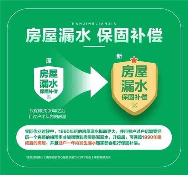 南京链家将对房屋漏水的风险保障写进安心服务承诺中,今年截至目前,仅“房屋漏水 保固补偿”单条承诺已经赔付209000元。“敢承诺,真赔付”,链家为每一笔房屋交易的安全保驾护航。