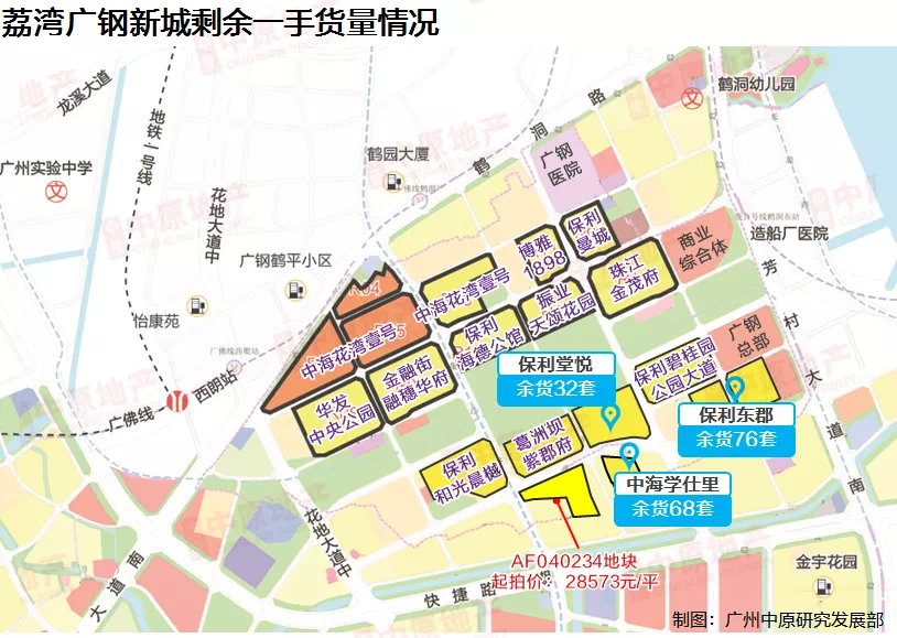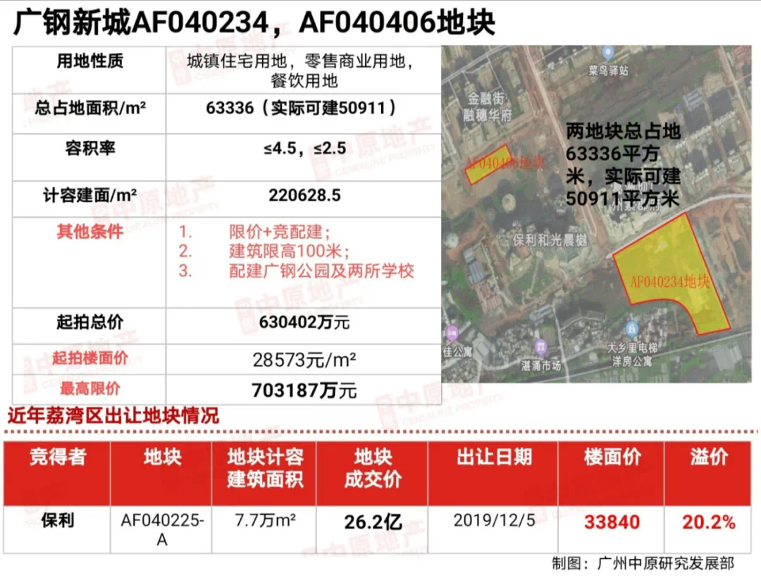 位于荔湾广钢新城板块的AF040234、AF040406地块,头顶“广钢新城最后一块宅地”的头衔,在近年供地稀缺的荔湾区备受市场关注。除自身63亿起拍价以外,该地块需配建广钢公园、学校、社区服务中心等,其成本亦达到8亿,实际拿地成本不低。其为目前荔湾区起拍楼面价第二高的地块,仅次于2019年南岸路冷冻厂地块36060元/㎡(即保利天珺项目)。