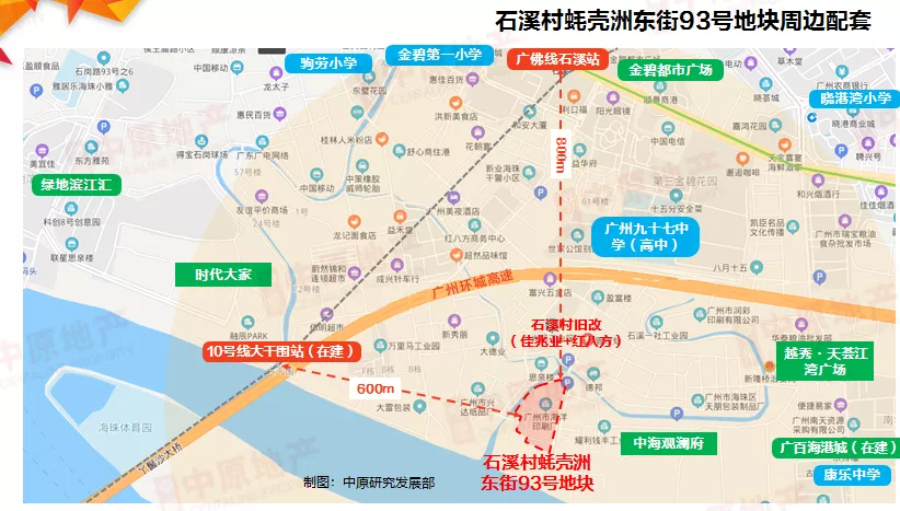 地块临近地铁广佛线石溪站(已开通运营)、地铁10号线大干围站(预计于2023年开通),各类配套资源较欠缺,近距离暂时没小学,商场也较远,要到地铁石溪站附近的金碧都市广场。未来随着石溪村旧改的深入推进,其整体配套资源、环境将会得到一定的改善。