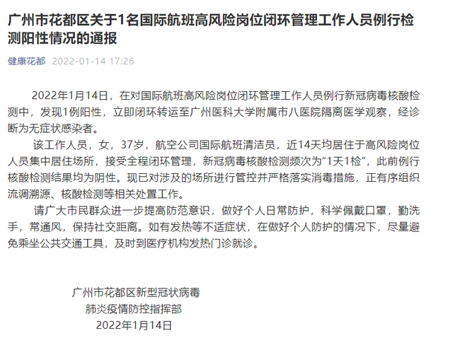 2022年1月14日,在对国际航班高风险岗位闭环管理工作人员例行新冠病毒核酸检测中,发现1例阳性,立即闭环转运至广州医科大学附属市八医院隔离医学观察,经诊断为无症状感染者。