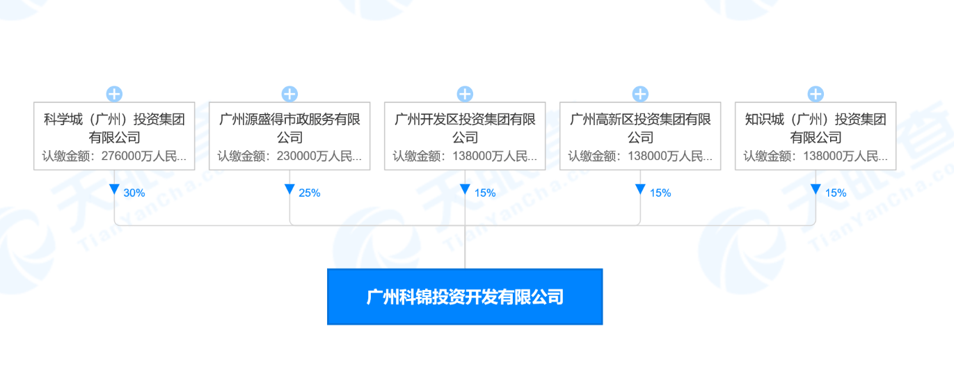 天眼查显示,广州科锦投资集团是科学城(广州)投资集团、广州源盛得市政服务有限公司、广州开发区投资集团、广州高新区投资集团、知识城(广州)投资集团等5家区属国企联合体。