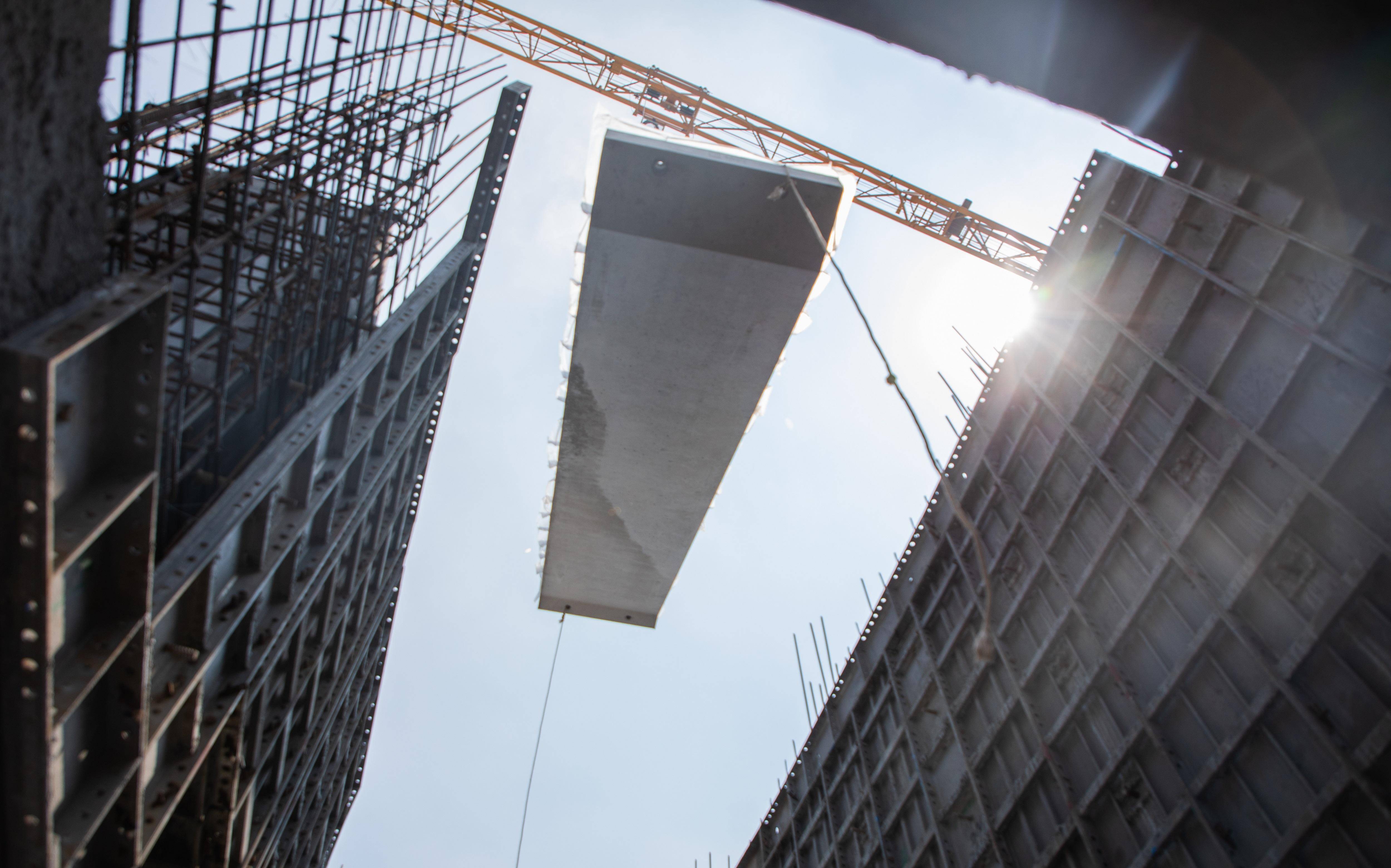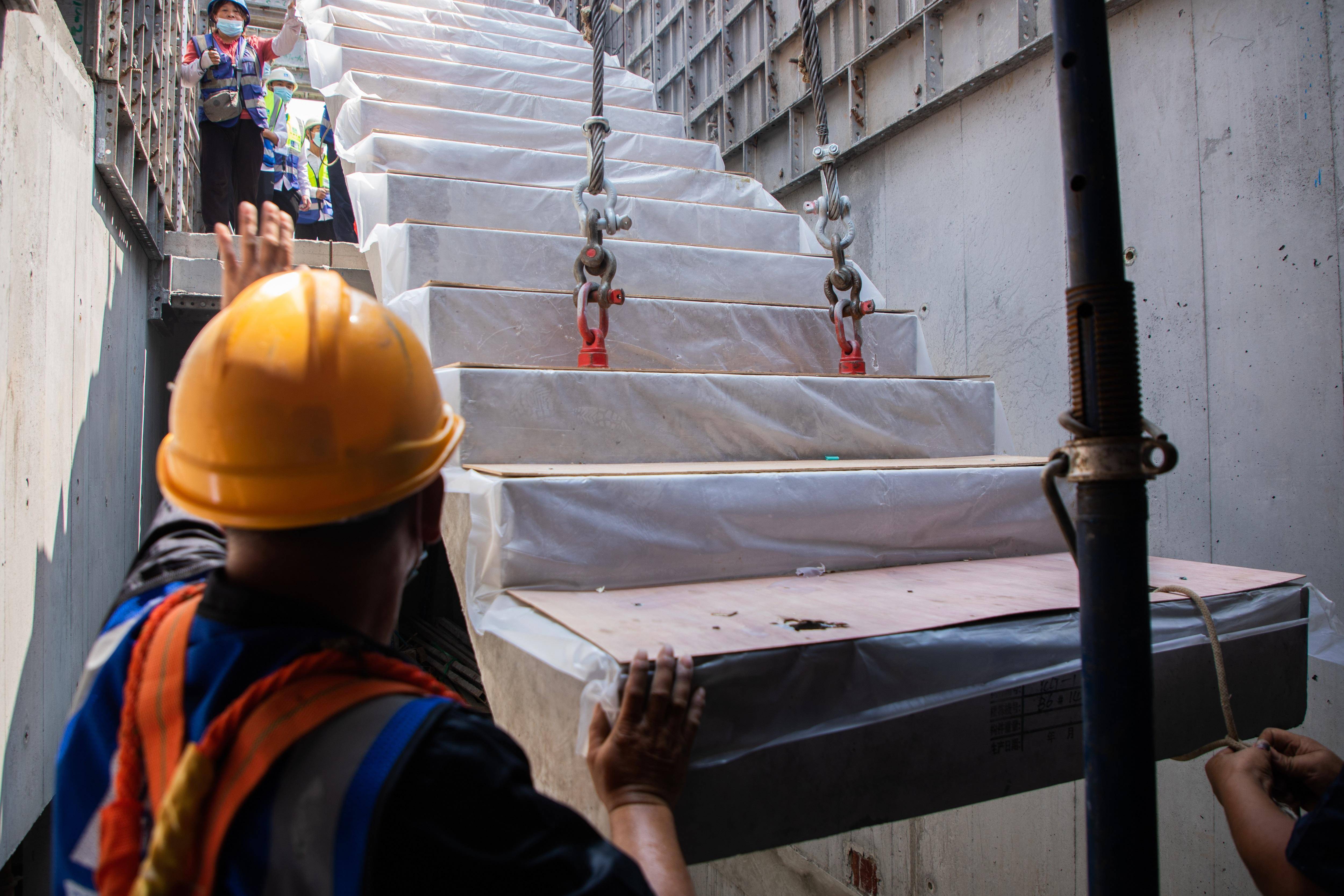 该项目正在紧张有序的建设中。图为预制楼梯吊装