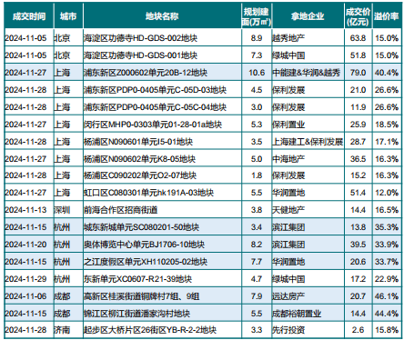 事实上,由于房企拿地持续聚焦核心城市优质地块,北上杭等核心城市多宗地块竞拍热度较高,这主要表现在溢价率上。11月底,为期两天的上海土拍最大的关键词便是“高溢价”。10宗地块中,有7宗溢价成交,且溢价率都在10%以上,平均溢价20%,为2024年最高。其中,上海浦东新杨思地块触达中止价转入“高品质建设”环节 ,溢价率达40.4%。