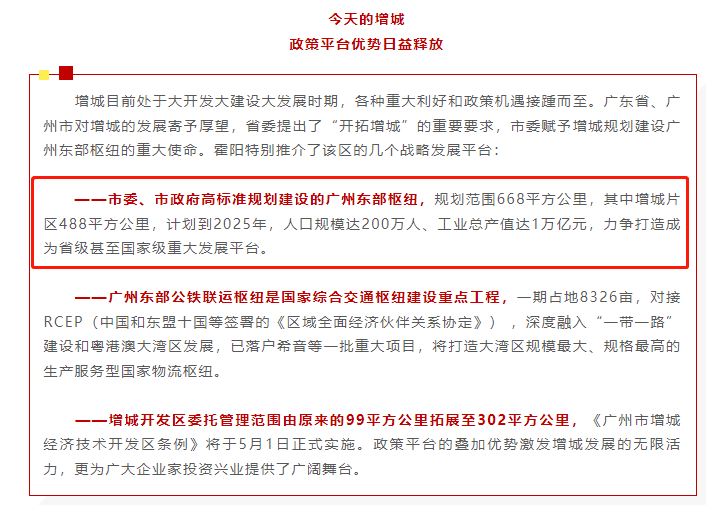 具体为:市委、市政府高标准规划建设的广州东部枢纽,规划范围668平方公里,其中增城片区488平方公里,计划到2025年,人口规模达200万人、工业总产值达1万亿元,力争打造成为省级甚至国家级重大发展平台。