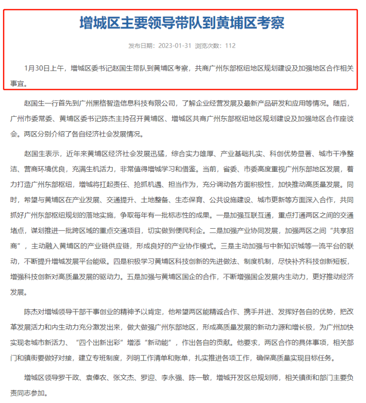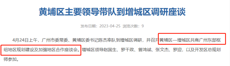 4月25日,增城区人民政府网站发布了一篇“黄埔区主要领导带队到增城区调研座谈”的文章。