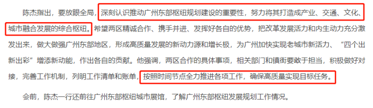 而广州市委常委、黄埔区委书记陈杰指出,要深刻认识推动广州东部枢纽规划建设的重要性,努力将其打造成产业、交通、文化、城市融合发展的综合枢纽。