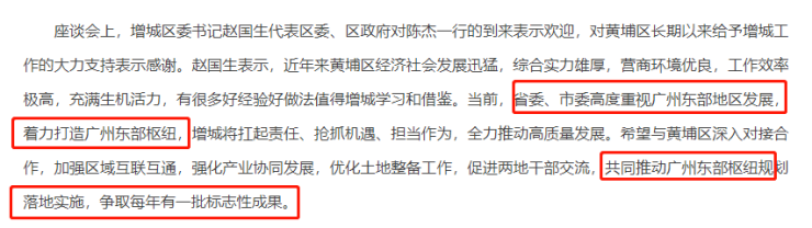 增城区委书记赵国生表示,当前,省委、市委高度重视广州东部地区发展,着力打造广州东部枢纽;希望与黄埔区深入对接合作,共同推动广州东部枢纽规划落地实施,争取每年有一批标志性成果。