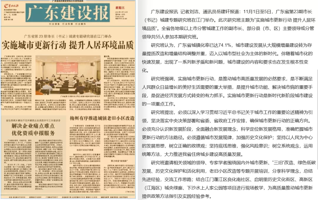另还在广东省第23期市长(书记)城建专题研究班(由广东省委组织部、省住房城乡建设厅、省自然资源厅和省生态环境厅联合主办的)《实施城市更新行动 提升人居环境品质》中,亦提到实施城市更新行动,是推动城市高质量发展的必然要求,是新时代新阶段城市建设的一项重点工作,要确保城市更新行动的正确方向,准确把握城市更新行动的方法路径。