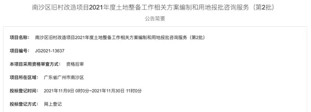 同时,我们看到前段时间(11月9日),广州公共资源交易中心公布了南沙区旧村改造项目2021年度土地整备工作相关方案编制和用地报批咨询服务(第2批)的公告,欲有效推动南沙区旧村改造项目用地供地。
