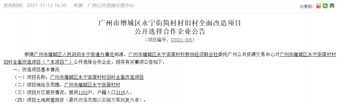 此前(2021年10月12日),广州公共资广州公共资源交易中心增城区永宁街简村村旧村全面改造项目公开选择合作企业公告。