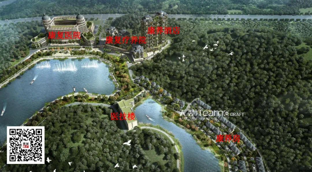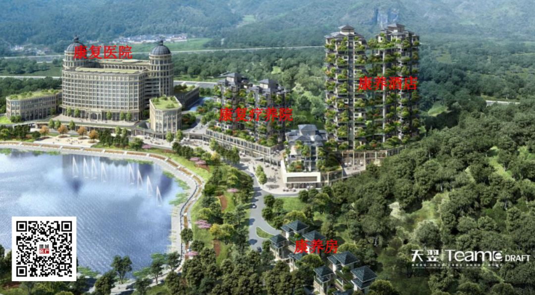 项目总体布局包括康复医院 1 栋、康复疗养院 1 栋、医技楼 1 栋、康养酒店 1 栋(配套商业楼)、康养房42 栋,建设病床数 600 张的三级康复医院及建设配套 400 床的康复疗养院和 930 床颐养型酒店。