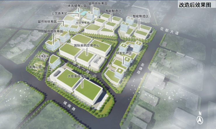 项目立足国土空间规划,围绕区域产业总体发展定位,瞄准炭步镇茶塘村“绿色食品”主导产业,坚持从问题导向出发,找准区域发展的矛盾点和短板,优先考虑完善优势产业链条,按照“招商对象精准化、招引项目链条化”的思路,进行精准“产业链招商”,结合“龙头企业”与相关下游企业配套需求,提前统筹谋划改造后的产业招商,在项目前期“量身定制”,将“需求”同“供应”挂钩,以“产业、空间、政策三位一体”的规划思维,瞄准数智化、信息化、标准化、现代化、国际化绿色食品全产业链条,通过构建食品产业“原料采购-产品开发-加工生产-交易结算-仓储物流”全链条生态,协同片区预制菜产业园形成上游原料供应与制造装备配套的互动关系,积极成为支持花都建设粤港澳湾区“菜篮子”与“菜盘子”基地的主阵地。项目导入超级蛋白产业园,依托自采自销模式,应用园区数智化运营系统打造“产、采、储、加、销”全产业链经营的大湾区最大型大豆原料产业园区,着力构建高标准建设专业产业园区。