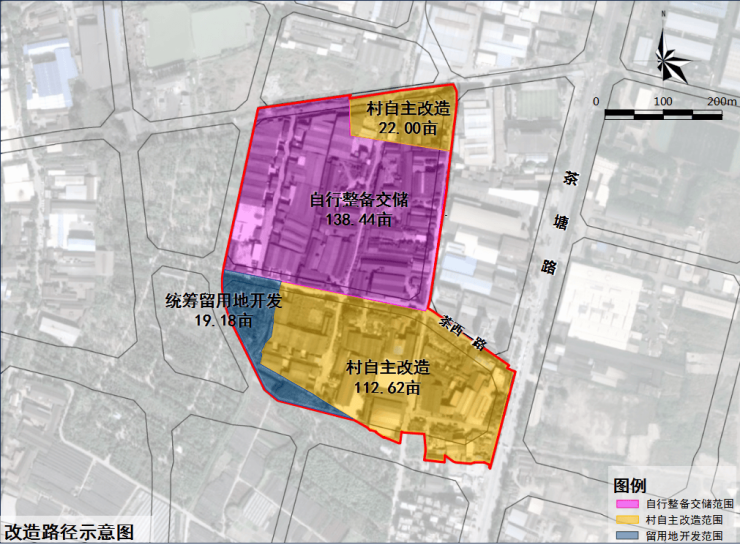 花都区茶塘村村镇工业集聚区改造项目采用部分用地政府收储出让+村集体自主改造+统筹留用地开发模式,由茶塘村整体打包前期征拆、土地整备工作,由政府主导用地审批、产业导入,由合作企业通过公开招标拿地并实施建设,将盘活低效存量用地和新征地相结合,通过“储改结合”的方式划定成片连片改造范围,为预留大产业和大项目创造空间载体条件,降低改造成本。