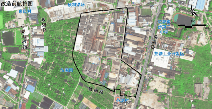 花都区茶塘村村镇工业集聚区改造项目位于花都区炭步镇茶塘村内,改造范围用地面积19.48公顷,现状建设量约11万平方米,均为村集体旧厂房,现状厂房建设标准低,产业以塑料制品、设备制造、家具制造业为主,综合容积率约为1.0,空置率较高,多用于出租,存在土地利用效率低、产值低下、产业落后、公共设施配套不完善等情况,是社会经济发展的瓶颈,亟需通过改造实现高产值、高效能、高技术的“华丽蝶变”。