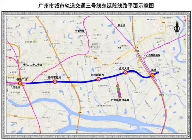 其中3号线东延段共设置3个枢纽综合体,其分别为番禺客运站、广州新城西停车场、金光大道站。