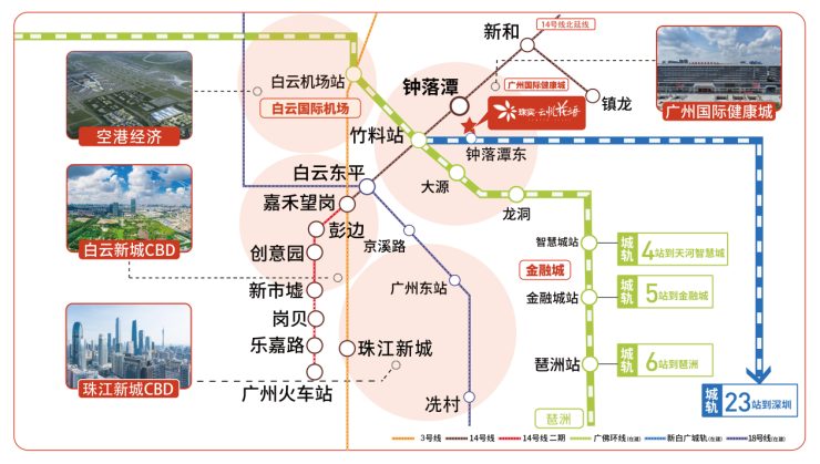 项目距离地铁14号线钟落潭站A出口约500米,依托地铁、城际、高速,畅行全城。未来14号线钟落潭站可换乘18号线北延段(预计2026年年底开通运营),可实现2站天河广州东,7站到珠江新城。