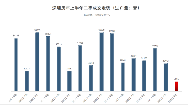 来自乐有家根据深圳官方平台统计的数据显示,2022年上半年,深圳二手房仅成交9965套,同比跌了近65%。这是2007年以来最差表现,比2008年上半年还要少52%,是近15年以来的上半年二手房成交的新低。另新房方面,2022年上半年深圳合计成交16126套新房住宅,同比亦减少38.3%。