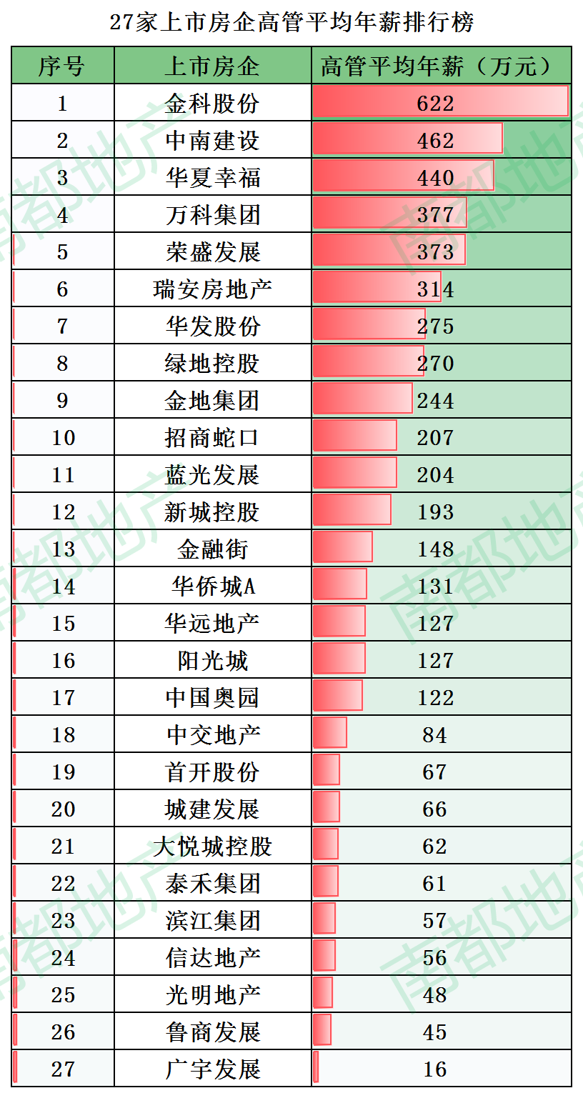 值得关注的是,高管平均年薪较高的房企总部不在北上广深,而是位于重庆的金科股份,17名高管平均年薪622万元;高管平均年薪最少的房企是总部在天津的广宇发展,高管平均年薪16万元。
