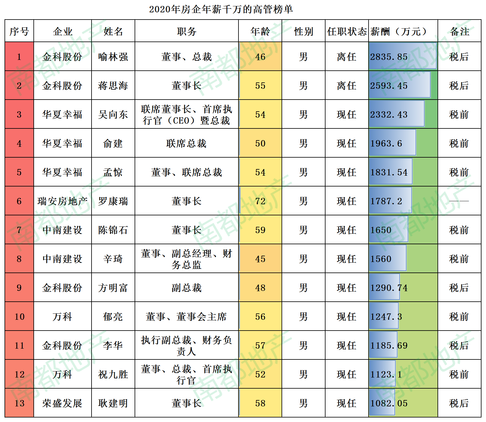13名年入千万高管中,有4人出自金科股份,有3人出自华夏幸福,中南建设、万科亦各有2人,此外瑞安房地产及荣盛发展各1人。13名高管都是男性,除了中南建设的财务总监之外,其余12人都是年逾50岁。