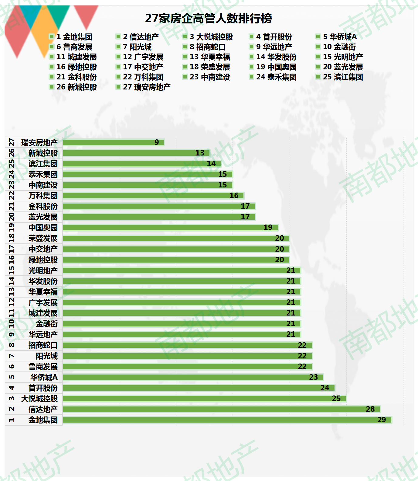 公布高管总薪酬的27家房企的高管人员(董事长、总裁、董事、监事、副总裁、董事会秘书等高级管理人员)达到537人。其中18家房企的高管人员超过20人,高管在13人至19人的有8家,另有香港的瑞安房地产有9名高管。