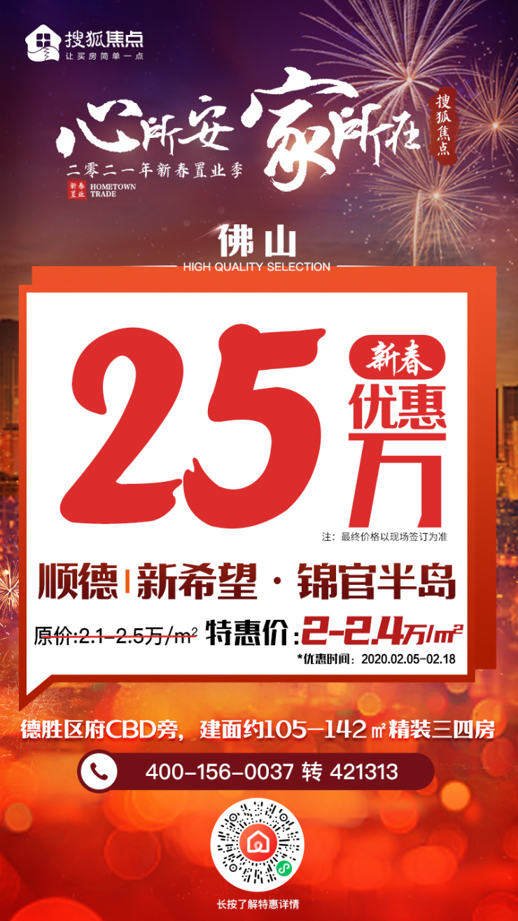 新希望·锦官半岛位于佛山顺德区府CBD旁,家门口就是江景公园,目前推出建面约105-142㎡精装三四房。项目新春一口价单位,较高优惠25万!