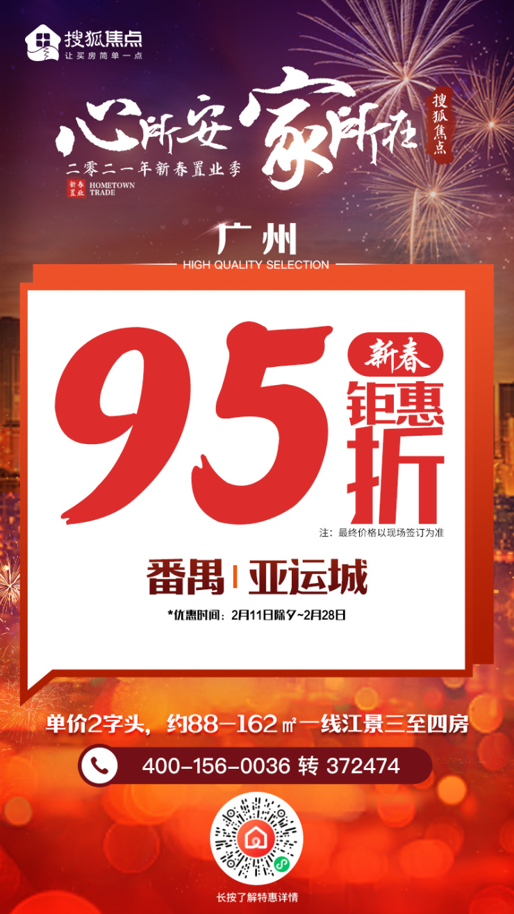 亚运城2021开门红新春钜惠95折,优惠时间:2月11日除夕~2月28日 项目目前在售的户型涵盖约88-162㎡一线江景三至四房,均价约27000元/㎡。广州亚运城位于康体路亚运城(地铁海傍站A出口)。