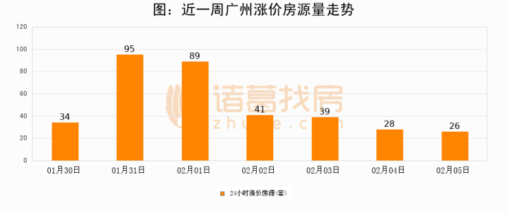 根据诸葛找房数据显示,广州24小时涨价房源量为26套,较02月04日减少2套,环比下降7.1%。与此同时,涨价房源占比小幅回落,对于购房者来说是一个入市窗口期,购房者可抓住时机入市。