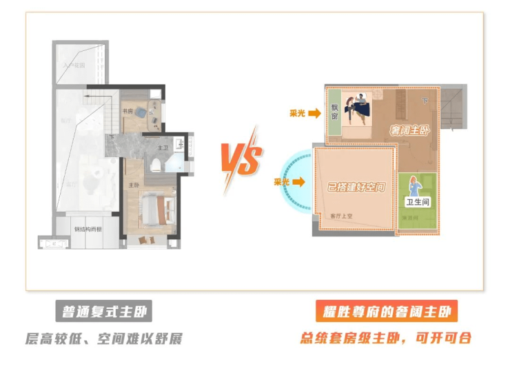 何为空间使用效率,可以是通过飘窗、阳台、5.8米高立体空间的高效利用,各个空间被赋予了多重的功能性,例如阳台和复式二层可以当作主人套层,丰富书房或者衣帽间可用于收纳和休憩,与家里的客厅、卧室等核心功能房间形成更好的互补效应,使空间效益最大化。