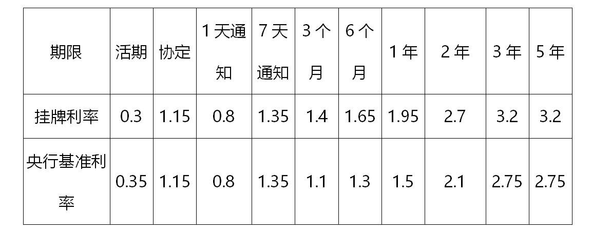 图:存款定价方式调整后,某行挂牌利率和央行基准利率表