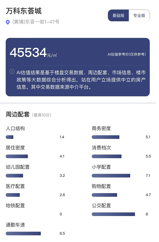 每经品房小程序显示,万科东荟城的估值参考价为45534元/平方米。但综合测评显示,未来5年房价会跑输黄埔区的平均涨幅,高于黄埔区25%小区。