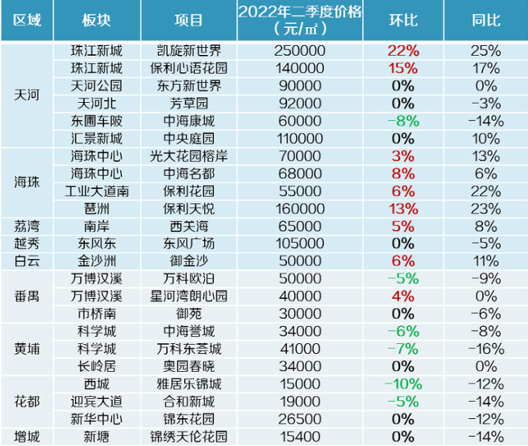 合富研究院较新发布的《2022年广州半年度总结及展望》报告显示,二季度广州中心五区具有优质资源(地段/景观/学位/交通等)的楼盘项目价格大多走升,环比涨幅在3%-22%,同比涨幅在6%~25%;而外围六区多数项目价格下跌,环比跌幅在5%~10%,同比跌幅较高的达16%。