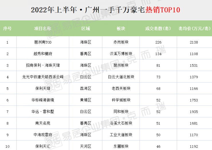 海珠区独占鳌头,主要的功臣则是琶洲南TOD。该项目今年上半年合计成交千万住宅226套,贡献了区域将近一半的成交量;此外,去年年底抢爆的招商保利·海珠天珺上半年亦录得81套成交。