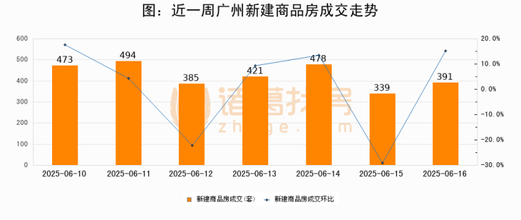 根据广州市住房和城乡建设局数据显示,2025年06月16日广州新建商品房成交391套,较昨日增加52套,环比上涨15.3%