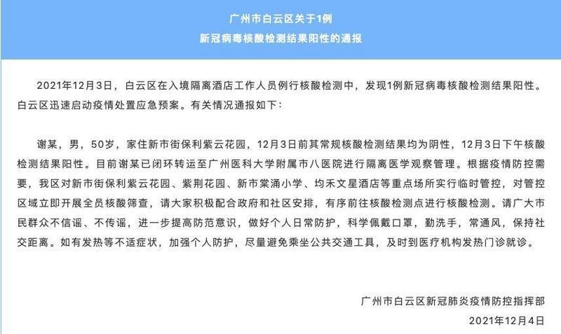 12月4日凌晨,广州市白云区新冠肺炎疫情防控指挥部发布通报称,2021年12月3日,白云区在入境隔离酒店工作人员例行核酸检测中,发现1例新冠病毒核酸检测结果阳性。白云区迅速启动疫情处置应急预案。
