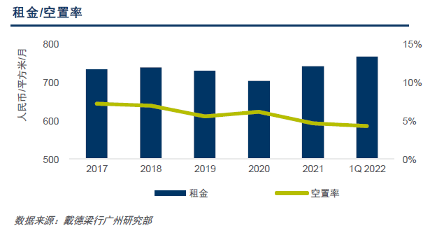 从行业需求来看,TMT仍是本季度的成交主力,成交面积占全市总成交面积的24.5%。互联网企业持续引领写字楼市场去化,本季录得腾讯租下铭丰广场12,000平方米办公空间,完成整合搬迁。值得注意的是,制造业的发展亦带来强劲需求,本季度成交面积占比达到15.8%,需求环比扩大3.7个百分点。季度内录得多宗大面积成交,例如大金空调租下复星国际中心11,000平方米办公面积用于扩租搬迁,电子光学仪器制造商捷欧路入驻万菱国际中心,以及LED照明及电池充电器品牌奈特科尔入驻TCL大厦等。对此,戴德梁行研究院副院长、华南区研究部董事张晓端分析表示,“广州市从2015年提出制造业和服务业‘双轮驱动’以来,制造业持续做优做强,面对疫情冲击亦积极调整。2021年,广州实现了工业占GDP比重回升。与此对应,我们观察到制造业于2021年中即开始释放对高端载体的需求,并延续至本季。另一方面,去年开始广州写字楼市场供应量井喷,也为承接制造业的需求提供了充足的空间。今年广州市政府工作报告提出‘坚持产业排名前列、制造业立市’,这一市场表现无疑是对此的较佳回应。”