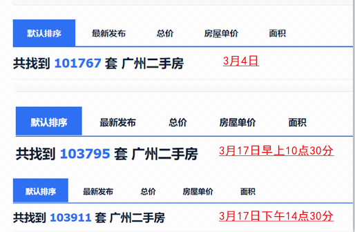 在3月4日,贝壳找房二手平台放盘挂牌量到达101767万套,突破10万套,在今日早上10点30分左右(即3月17日)则已有103795套,十来天时间继续暴增2000多套,甚至小编在下午14点30分再进入的时候,已显示103907套!