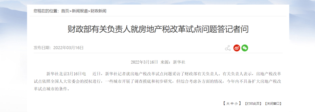 首先,在去年10月底提出的开展房地产税改革试点工作已有新的答案,国家财政部负责人回复:“房地产税改革试点依照全国人大常委会的授权进行,一些城市开展了调查摸底和初步研究,但综合考虑各方面的情况,今年内不具备扩大房地产税改革试点城市的条件。”