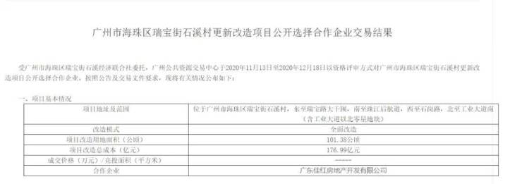 早在2009年,石溪村向广州城市更新局申请改造,开展土地勘测、确权、房屋测量等数据摸查工作。2017年年初,石溪更新改造工程项目被纳入广州市2017年城市更新计划。2020年,佳兆业、红八方联手拿下石溪村旧改,投资金额高达176.99亿元。